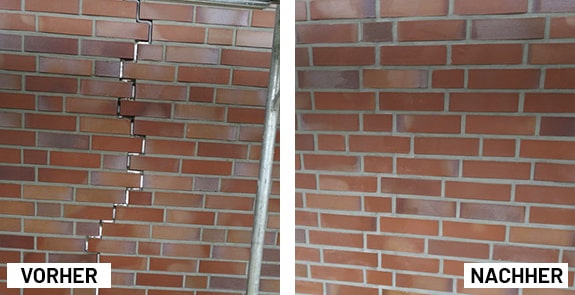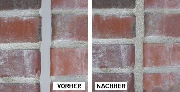 Nach Einbringung des Dichtstoffes in die Fuge wird dieser mittels Hochdruck besandet. Die Körnungsstärke des Sandes (oder anderes körniges Material) wird vorher dem zu verfugenden Werkstoff angepasst. Die Fugen wirken dann optisch wie Mörtelfugen, behalten aber ihre guten mechanischen Eigenschaften. Dieses Verfahren eignet sich hervorragend zur optischen Anpassung an Steinfassade, Travertin oder andere Flächen wie Klinker oder Marmor. Der Sand wird so auf die Silikonfuge aufgetragen, dass er etwa 0,5 - 1 mm in die Silikonschicht eindringt um nach Aushärtung des Silikons ein Auswaschen durch äußere Einflüsse zu vermeiden.Wir beraten sie auch gerne über andere Möglichkeiten der Oberflächenstrukturierung.